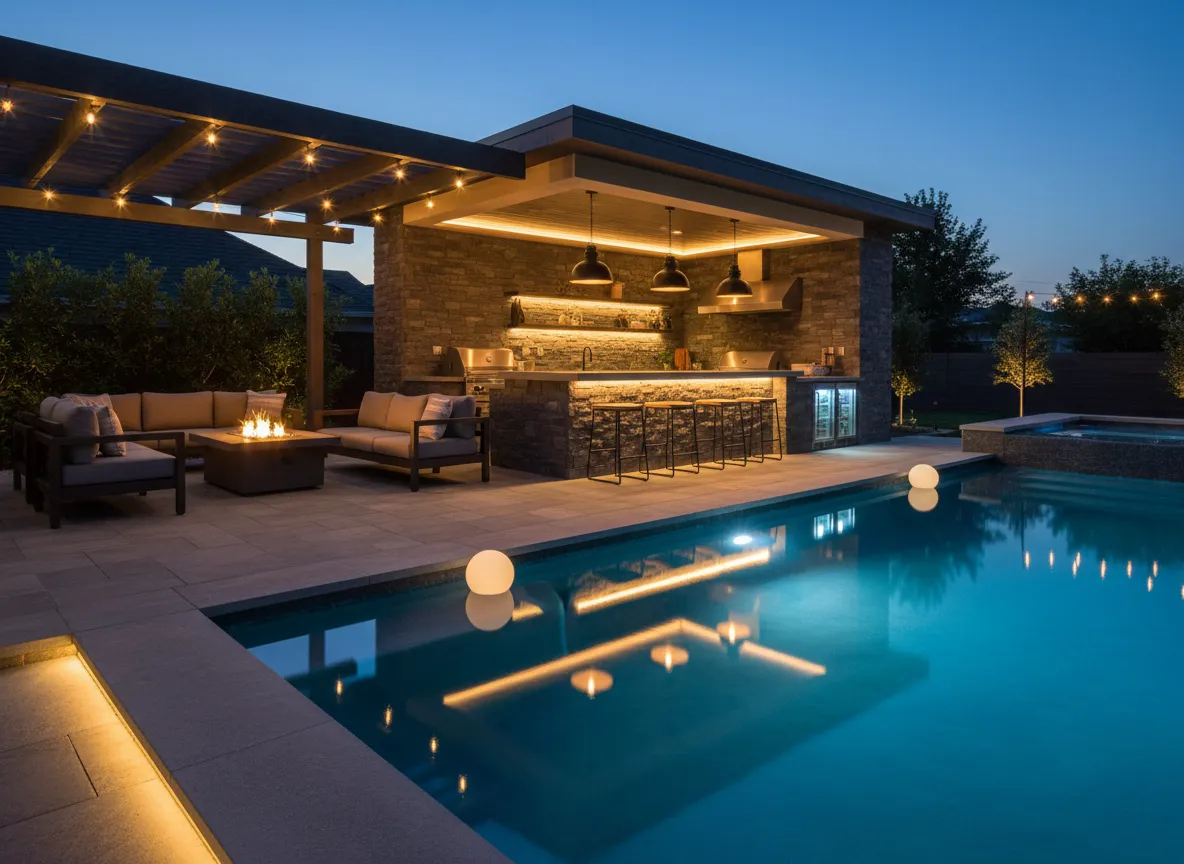 Custom pools integrated with patios, outdoor kitchens, lighting, and landscaping for a true resort flow.